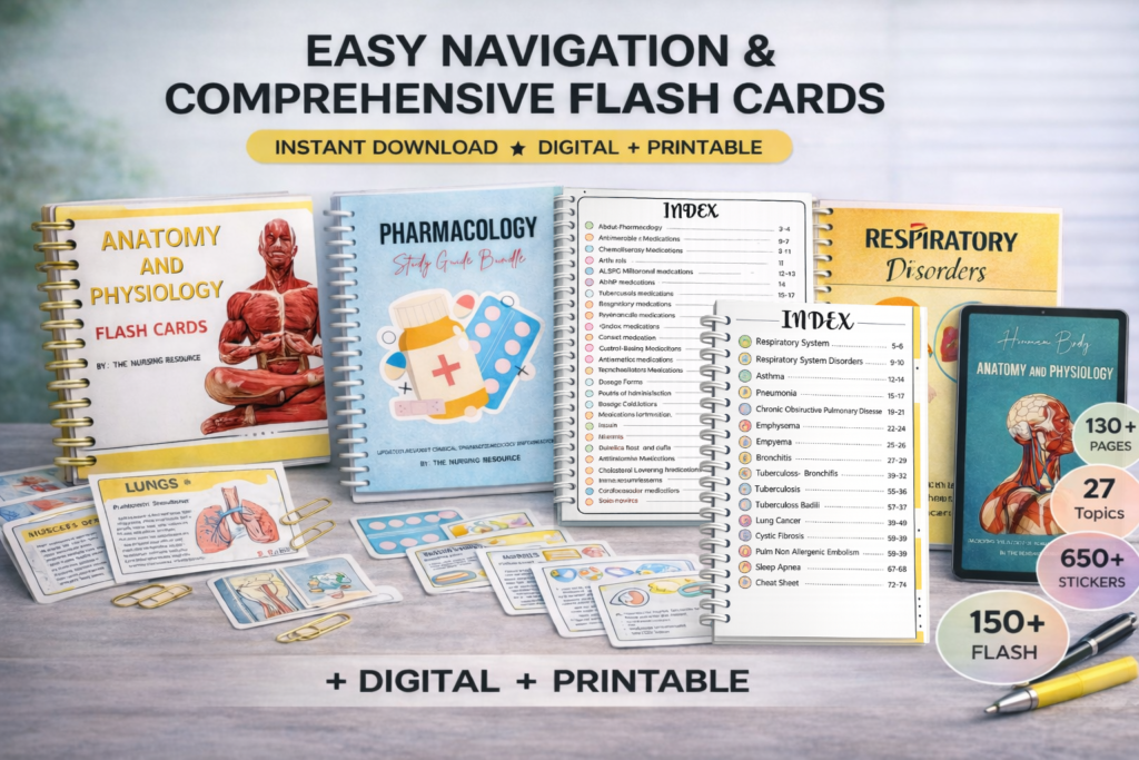 A practical, visual guide with 60 focused pages covering respiratory health, pathophysiology, and care strategies. Includes 70+ respiratory flashcards and 285+ respiratory stickers to reinforce learning through active recall and visual memory. Designed in two layouts (portrait and landscape) for flexible study, helping you master respiratory disorders with clarity and retention.